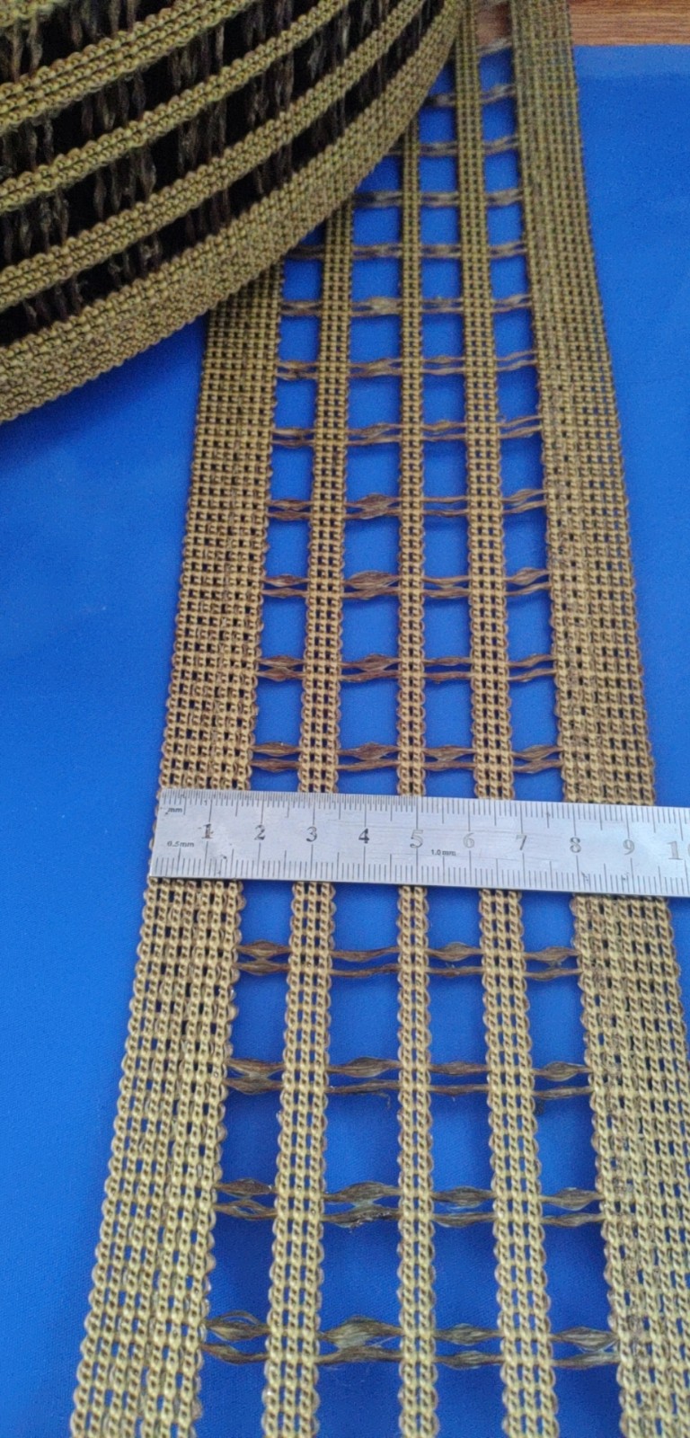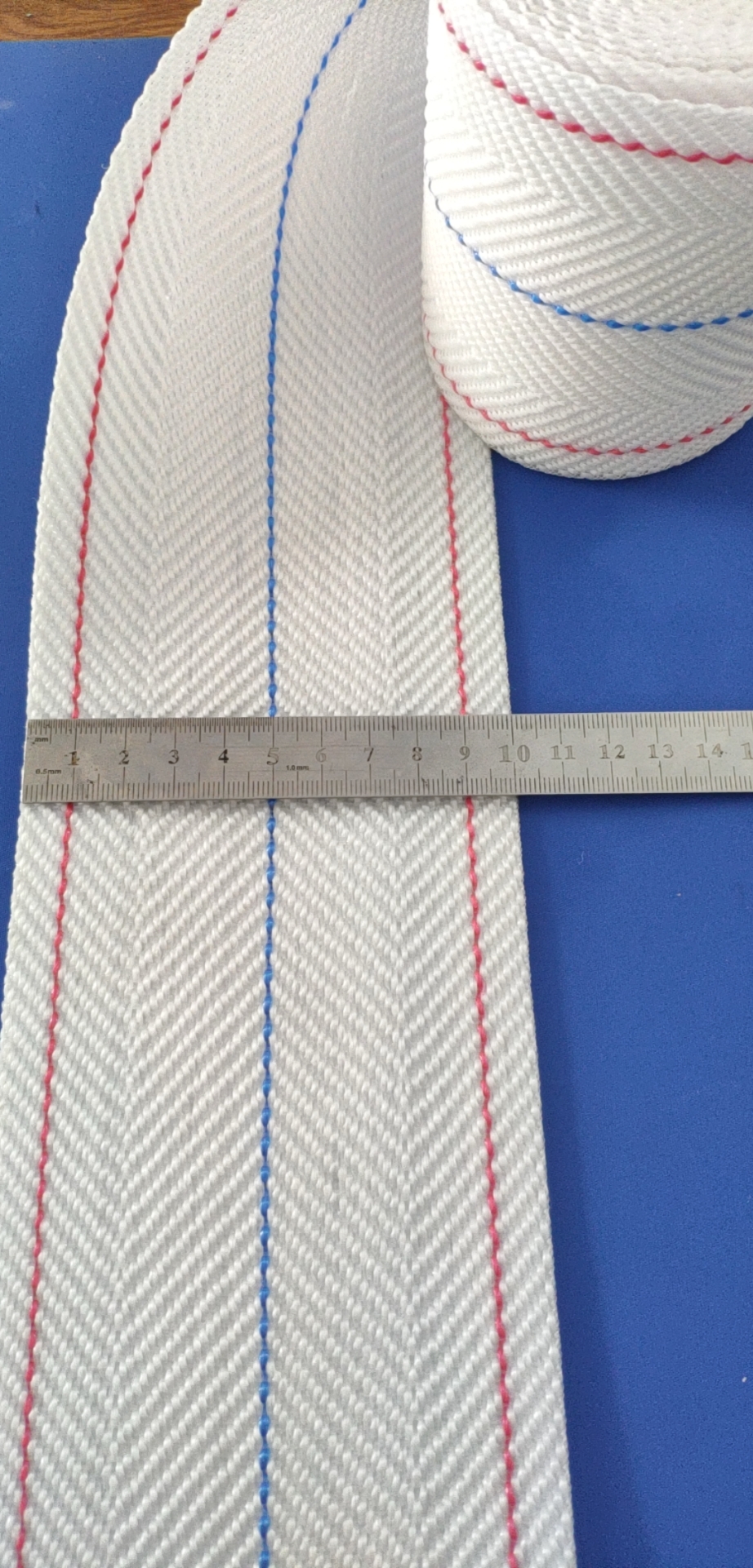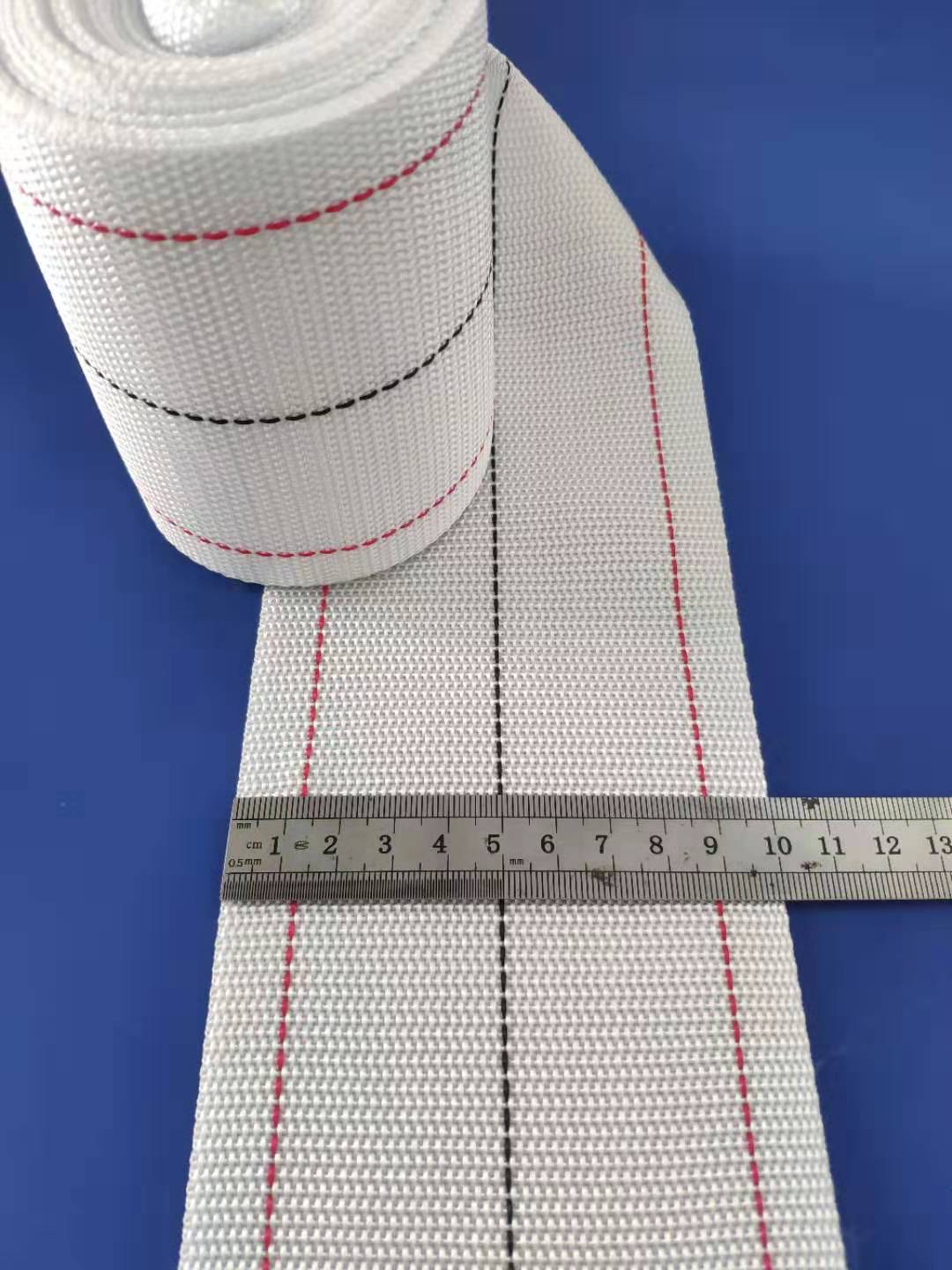 常规规格:宽度:100mm, 长度根据要求定制。颜色为白色底色,中间一条蓝色线,两边可加红色线。